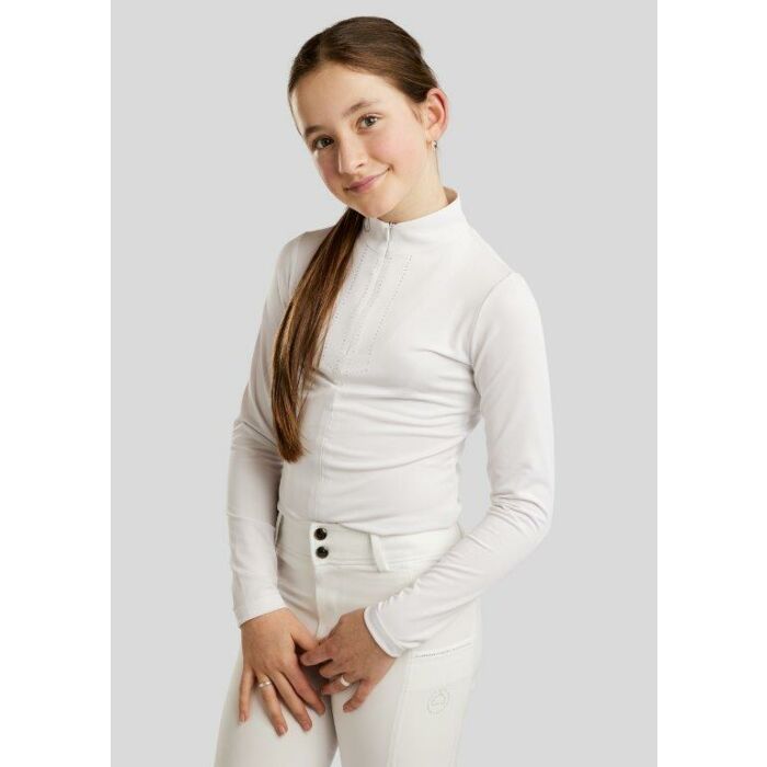 Het Wedstrijdshirt Montar MoCha White is ontworpen voor ruiters die tijdens wedstrijden een professionele, verzorgde uitstraling willen combineren met een vleugje glamour. Dit long-sleeved wedstrijdshirt heeft een tijdloos en flatterend model dat de vrouwelijke silhouet benadrukt en tegelijkertijd optimale bewegingsvrijheid biedt. De borst is versierd met schitterende holografische kristallen die het licht vangen en zorgen voor een exclusieve, verfijnde uitstraling. Op de kraag bevindt zich een holografisch Montar-logo in folieprint, wat het geheel een moderne en elegante afwerking geeft. Dankzij het lichte, ademende materiaal van 100% polyester voelt het shirt comfortabel aan, zelfs tijdens lange wedstrijddagen. Het Montar MoCha wedstrijdshirt biedt een perfecte balans tussen functionaliteit en luxe, zodat je niet alleen opvalt door je prestaties, maar ook door je stijlvolle verschijning. Verkrijgbaar bij Ruitersport Equidrôme in Venlo.
